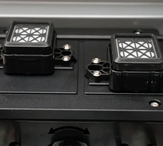 Impresora ecosolvente con doble cabezal de impresión para alta velocidad y precisión, ideal para producción de carteles publicitarios, señalética, papeles decorativos (wallpapers) y aplicaciones interiores y exteriores.